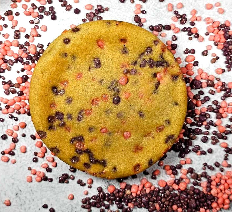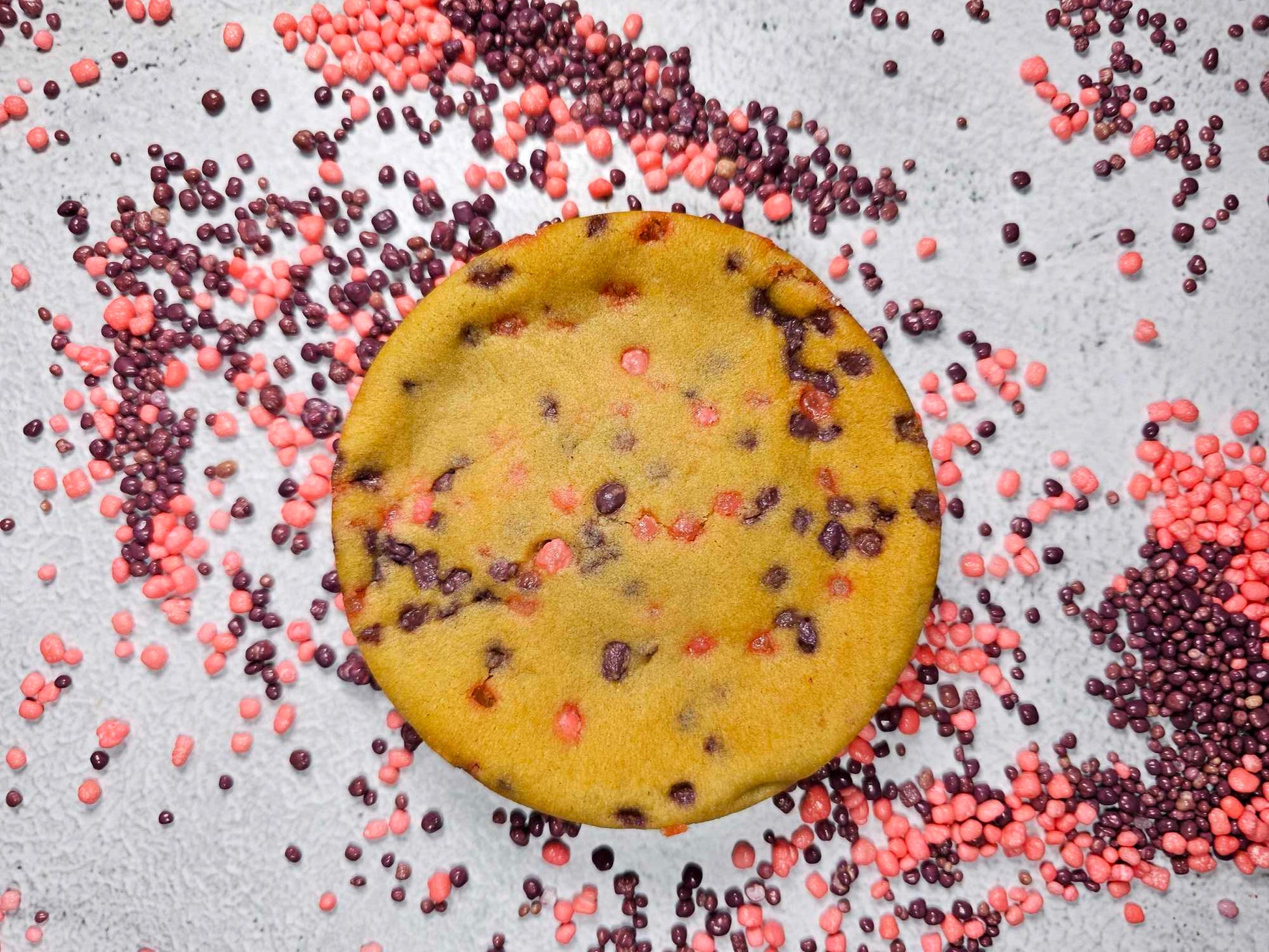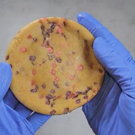 Introducing our latest creation: The Nerd Herd Cookie! This playful mashup combines our classic brown sugar cookie with a burst of colorful candy. Tangy grape and sweet strawberry Nerds are mixed into our chewy dough for a delightful surprise in every bite. It's a fun and flavorful adventure you won't want to miss!
